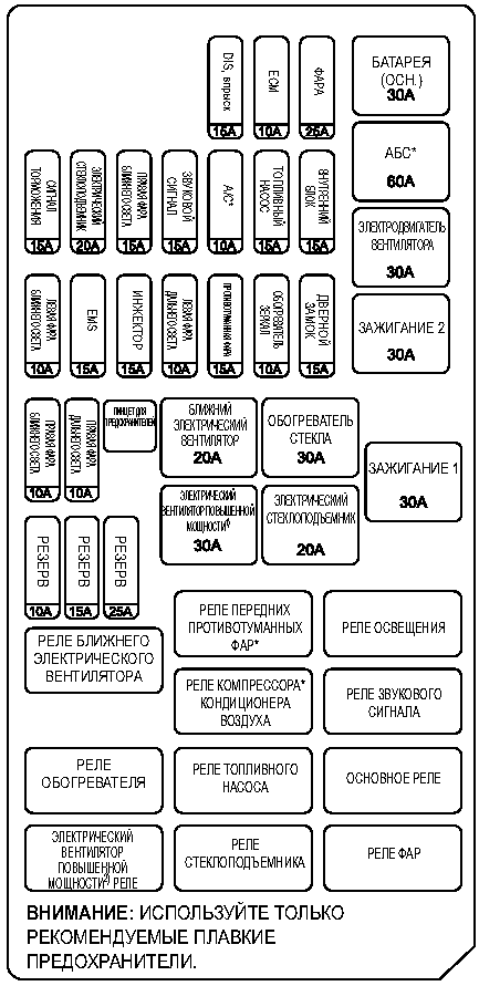 Chevrolet Lacetti / Руководство по техническому обслуживанию и эксплуатации автомобиля Chevrolet Lacetti / Встроенный индикатор предельного износа протектора / Блок предохранителей в моторном отсеке