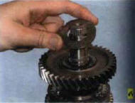 12. Спрессуйте со шлицев вала синхронизатор I и II передач вместе с ведомой шестерней II передачи, прикладывая усилие к торцу шестерни.