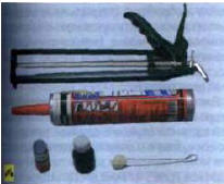 Так выглядит набор для вклейки стекол. Он состоит из тубы с клеем, наконечника тубы, активатора/очистителя, грунта.